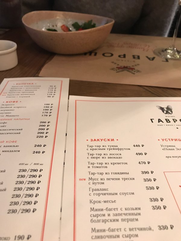 Посетили бистро 11 июня.Вечер испорчен.Салаты не просто не свежие,а простоявшие на жаре несколько часов,сырная тарелка из двух видов сыра,видимо,авторская концепция.Обслуживание неспешное и бестолковое-ждали напитки 30мин,официант сначала налил мужчинам,затем дамам,при этом залив стол.Бистро это быстро,недорого,вкусно.Ничего из этого в Гавроше вы не найдете.Однозначно не рекомендую