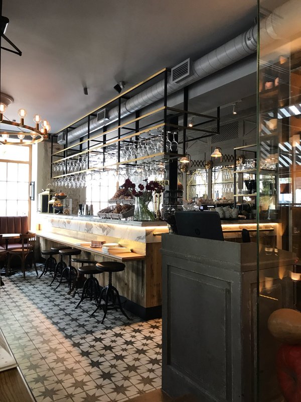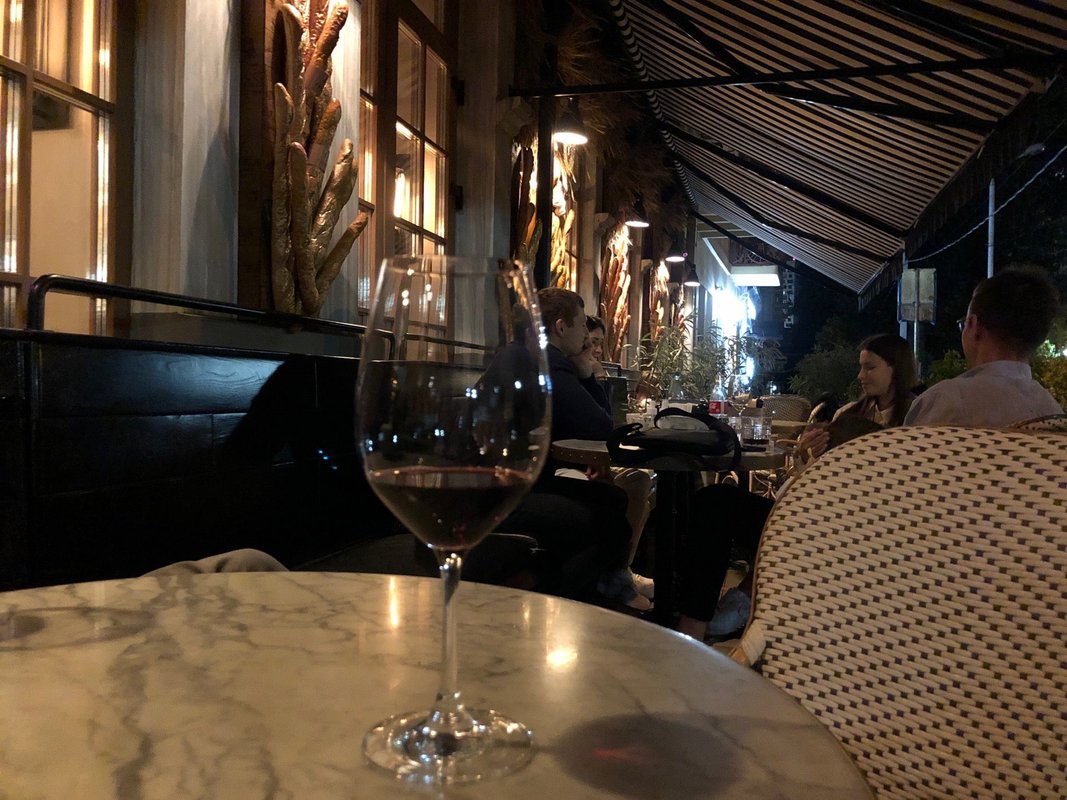 Меню - один сплошной завтрак (яичницы, круассаны, паштеты). Вина по бутылкам в районе 3000 руб. Есть коктейли около 350 руб. Пива только два вида по 250 руб. Очень приветливые и услужливые официанты.