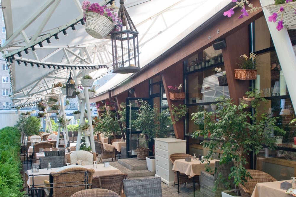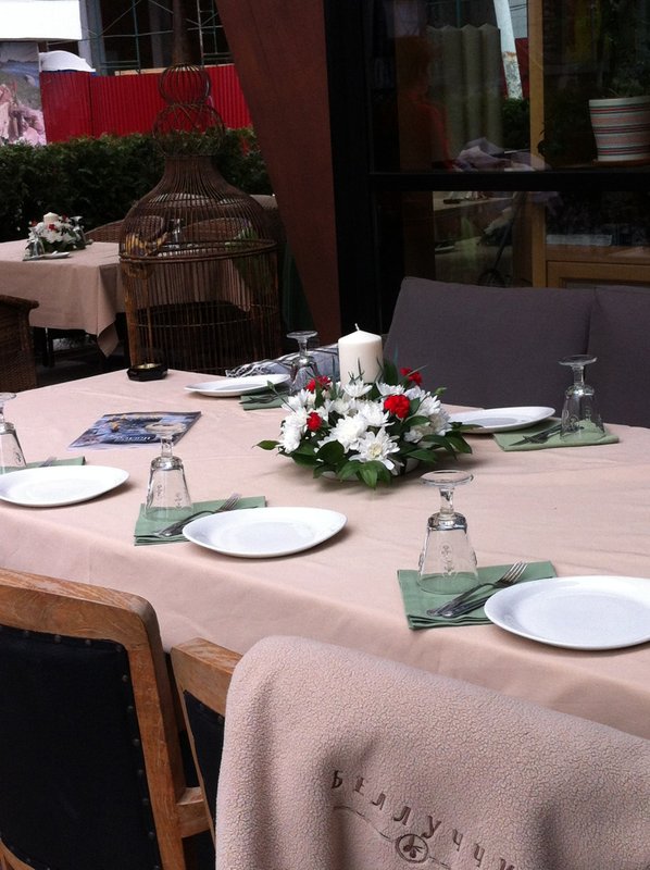 Если за окном стоит тёплая погода, гораздо приятнее находиться в открытом пространстве. И не только чтобы погулять, но и встретиться с близкими и вкусно поесть. Специально для таких случаев у ресторана Беллуччи имеется веранда с выходом на улицу.